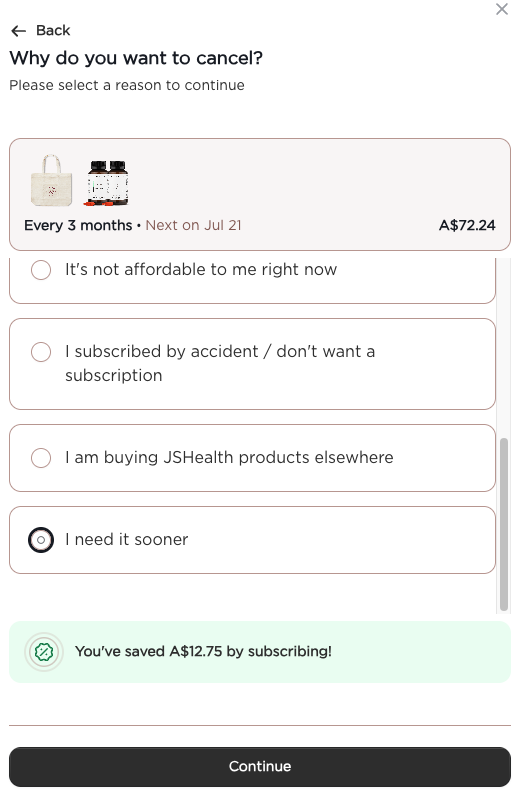 Tell us why you have decided to cancel > continue